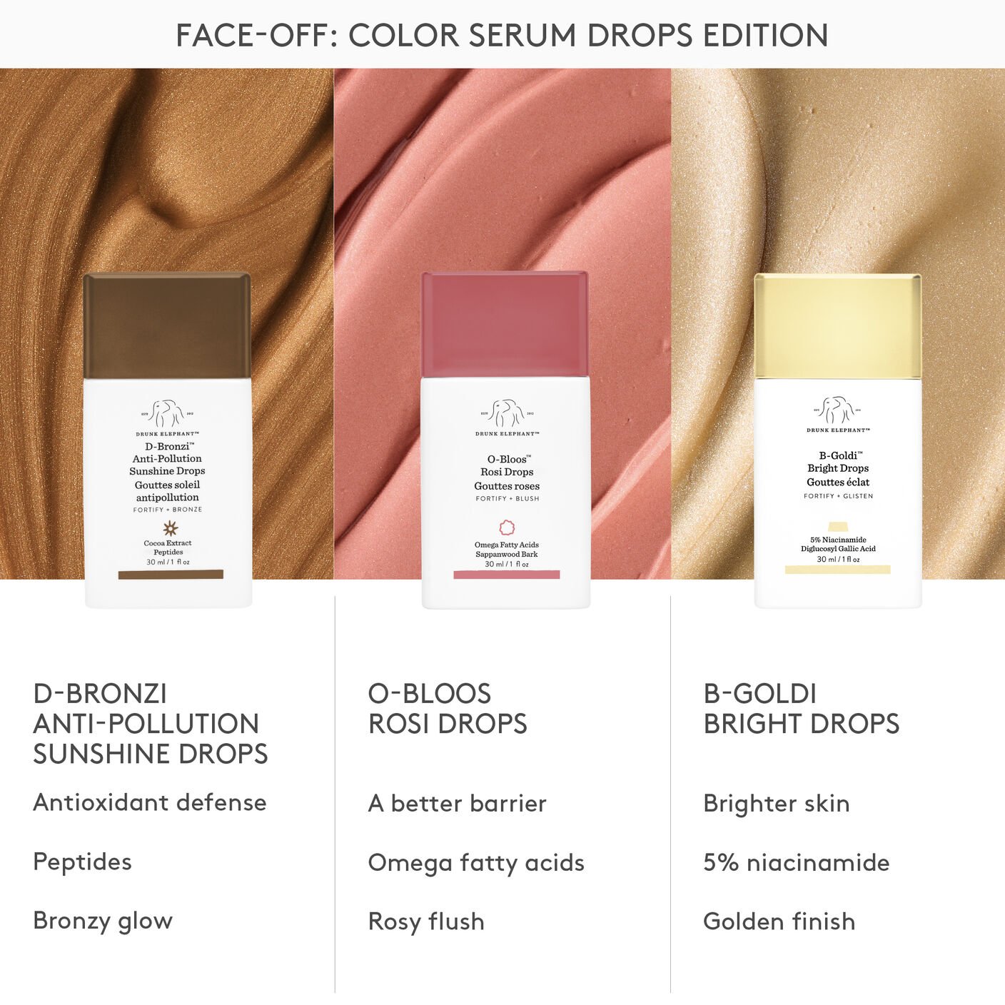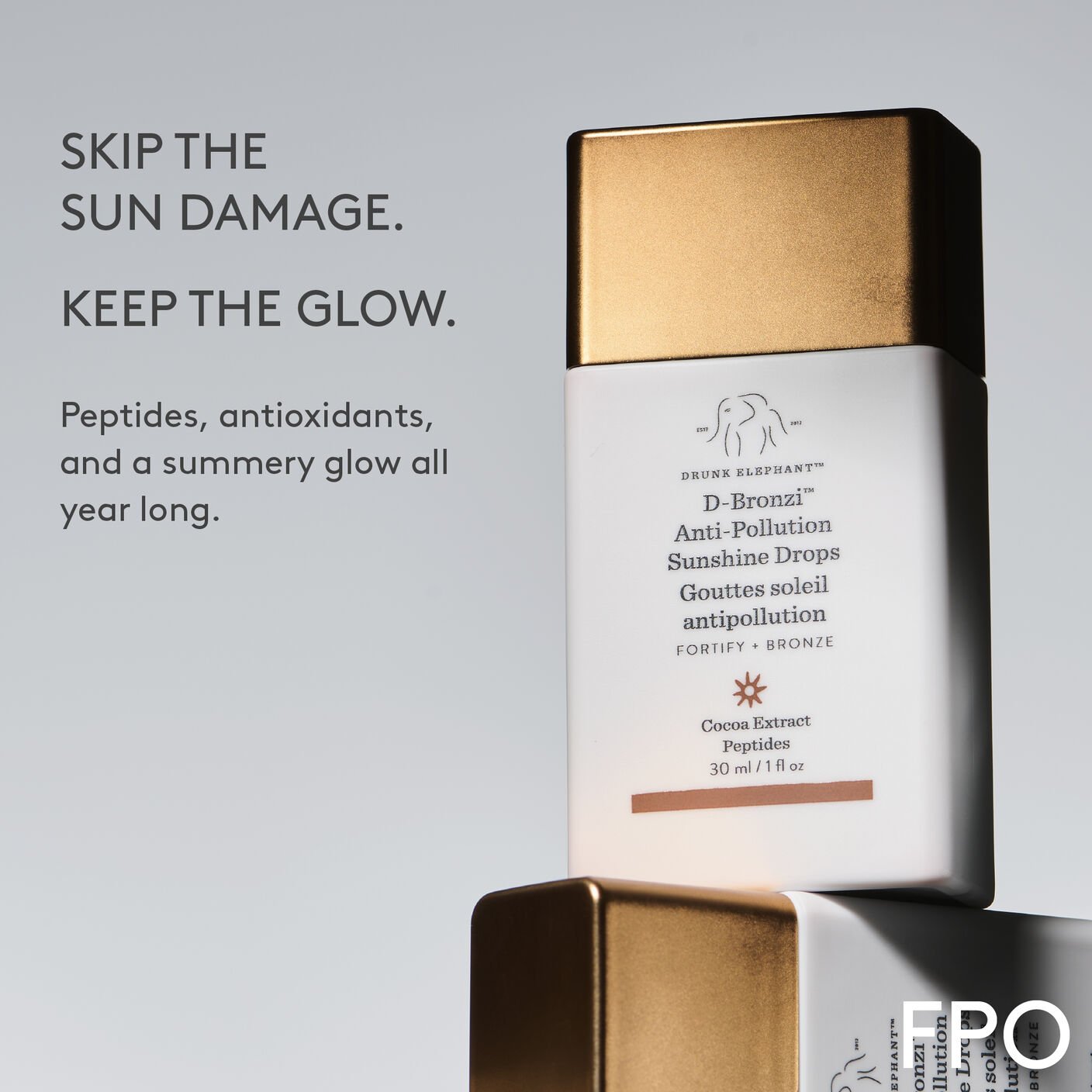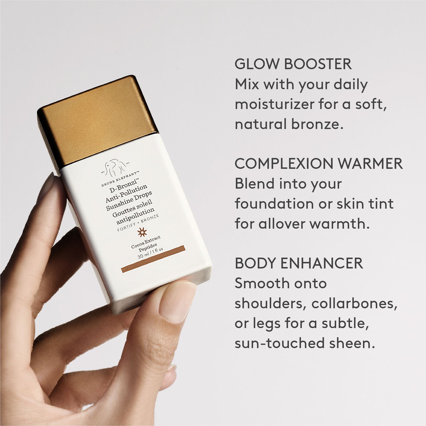 Agiter avant utilisation. Appliquer une goutte ou plus sur la peau. Peut être utilisé avec n’importe quel sérum, huile ou crème Drunk Elephant.
